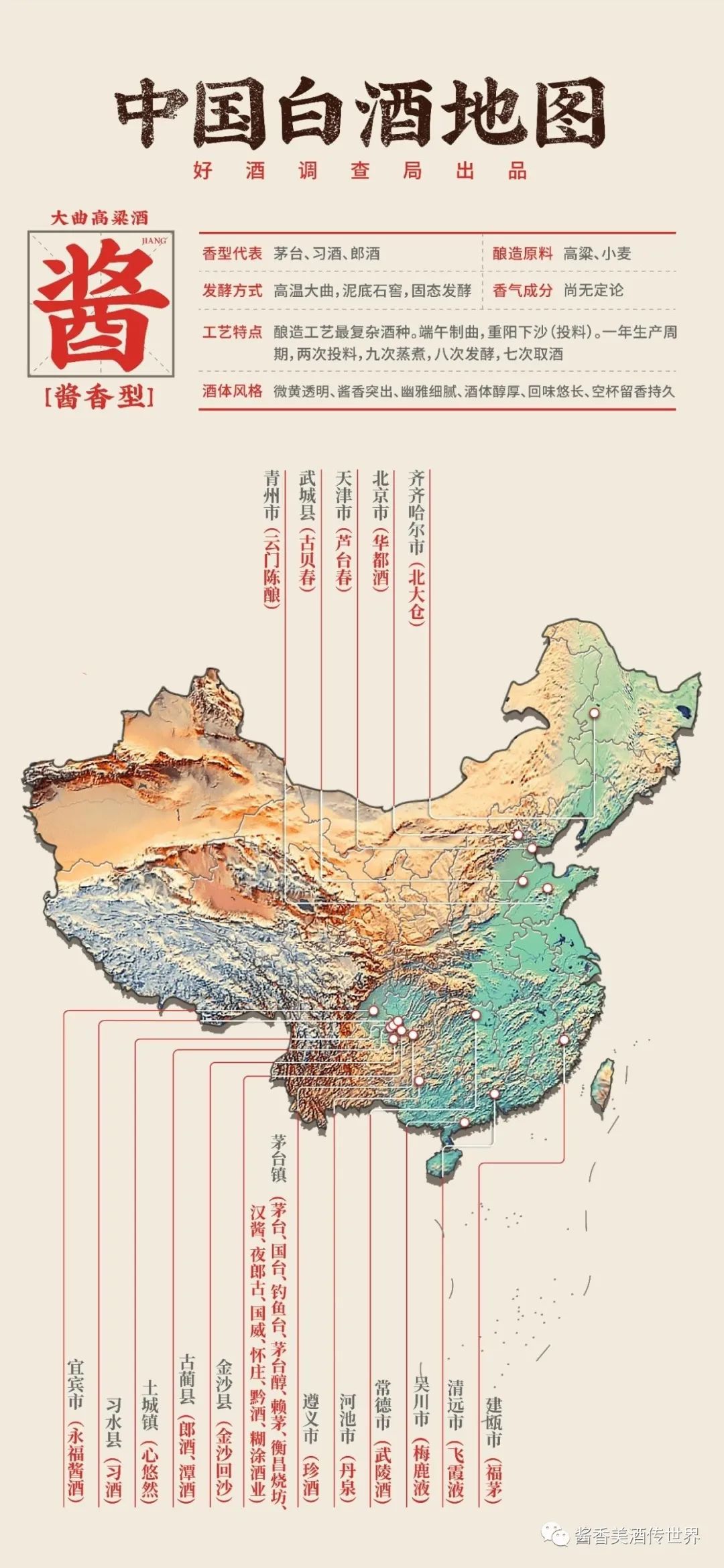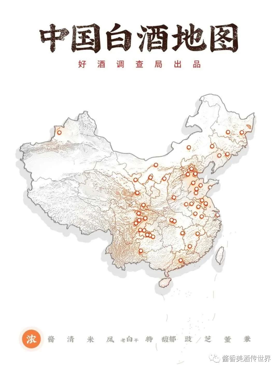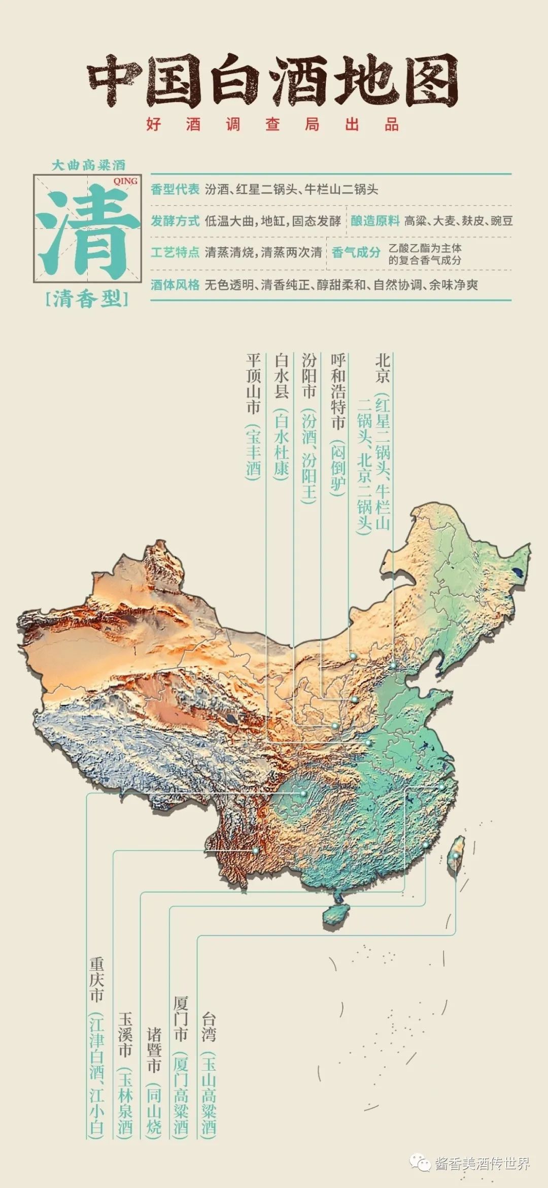 清香型白酒,以缸为发酵容器,所以不受窖池的限制,缸到哪里,清香到哪里,没有复杂的窖池。从清末开始,很长一段时间,清香汾酒一直影响着我国白酒市场,汾酒的传播版图也是最大的。而此图却少了一个大曲清香、国家名酒——武汉黄鹤楼。还有青稞酒目前也是清香工艺。