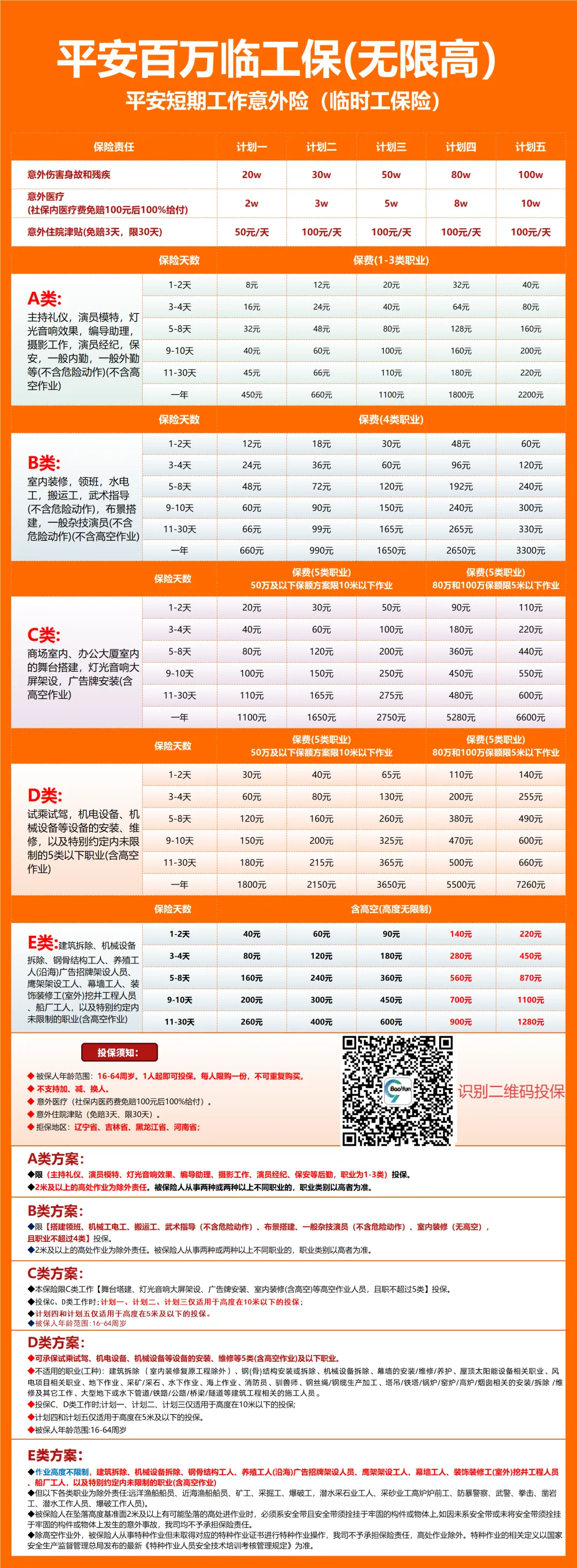 A类方案:限(主持礼仪、演员模特、灯光音响效果、编导助理、摄影工作、演员经纪、保安等后勤,职业为1-3类)投保。2米及以上的高处作业为除外责任。被保险人从事两种或两种以上不同职业的,职业类别以高者为准。B类方案:限【搭建领班、机械工电工、搬运工、武术指导(不含危险动作)、布景搭建、一般杂技演员(不含危险动作)、室内装修(无高空),且职业不超过4类】投保。2米及以上的高处作业为除外责任。被保险人从事两种或两种以上不同职业的,职业类别以高者为准。C类方案:本保险限高度"X"米及以下的C类工作【仅适用高度"X"米及以内的舞台塔建、灯光音响大屏架设、室内装修,且职业不超过5类】投保。X释义:50万及以下保额方案限10米以下;80万及以上保额方案限5米以下。D类方案:可承保试乘试驾、机电设备、机械设备等设备的安装、维修等5类(含高空作业)及以下职业。不适用的职业(工种):建筑拆除 (室内装修复原工程除外)、钢(骨)结构安装或拆除、机械设备拆除、幕墙的安装/维修/养护、屋顶太阳能设备相关职业、风电项目相关职业、地下作业、采矿/采石、水下作业、海上作业、消防员、驯兽师、钢丝绳/钢缆生产加工、塔吊/铁塔/锅炉/窑炉/高炉/烟囱相关的安装/拆除 /维修及其它工作、大型地下或水下管道/铁路/公路/桥梁/隧道等建筑工程相关的施工人员。50万及以下保额方案限10米以下;80万及以上保额方案限5米以下。E类方案:真正的高空无限制