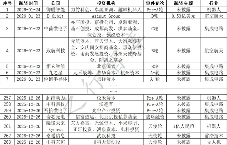 2.投融动态:本期智能技术领域(包括前沿技术、无人机、机器人等行业)投融资活动较上期大幅增加。根据iFinD统计数据,本期智能技术领域共发生263起投融资事件,较上期的242起增加21起。在披露具体金额的投融资活动中,国内方面,豪威集团以47.99亿港元的IPO位居榜首,具体投资方未公布;国外方面,Skild AI以14亿美元的战略融资位居榜首,具体投资方为1789 Capital、Bezos Expeditions、LG集团、Macquarie麦格理、Salesforce、Samsung Ventures三星等。