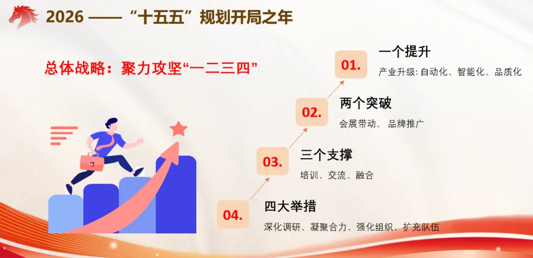 针对新的一年奋斗目标,他指出:在“十五五”新征程上我们仍然要在市委统战部、市工商联的引领下,坚持“做强特色产业、壮大特色板块、唱响特色品牌”这一根本宗旨不动摇,充分发挥商会的独特功能和服务优势,尽全力为提升超硬材料新质生产力发展再立新功。主要奋进目标是围绕“推动一个提升、实现两个突破、形成三个支撑、强化四大举措”上聚力攻坚,尽全力为全市超硬材料产业高质量发展奉献智慧,全面推动产业发展再上新台阶。