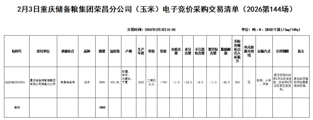 受重庆储备粮管理集团有限公司荣昌分公司委托,重庆市粮油批发市场有限责任公司(即国家粮食重庆交易中心,以下简称“批发市场公司”)定于2026年2月3日10:00举办重庆储备粮集团荣昌分公司(玉米)电子竞价采购交易会,现将有关事项公告如下:
