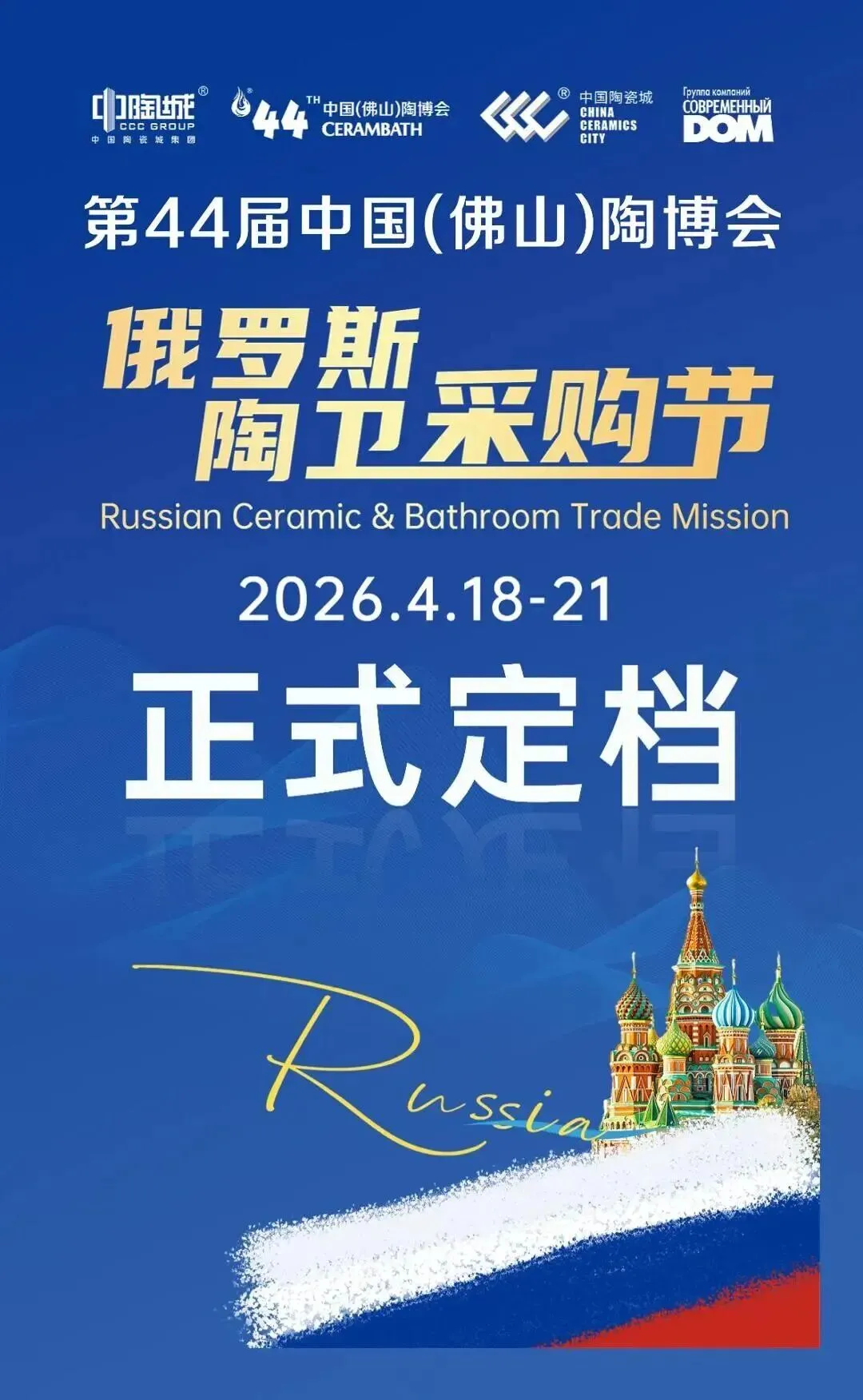 1月26日,第44届中国(佛山)陶博会俄罗斯陶卫采购节正式定档4月18-21日,邀您共同探讨最新国际市场情况,对接商务需求。
