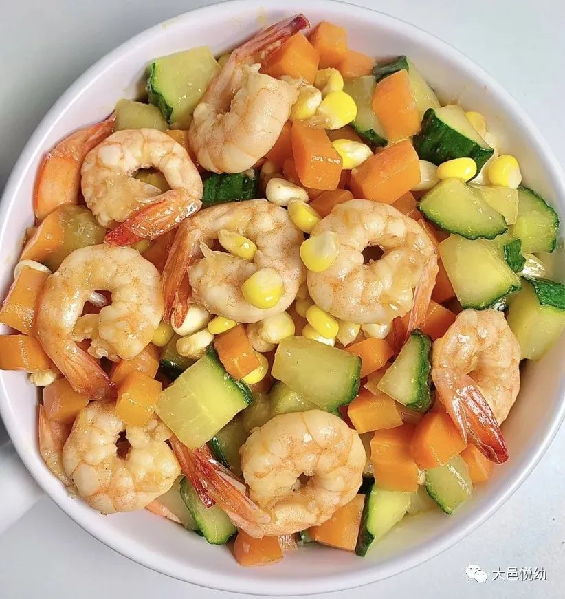 材料: 虾仁 500 克,黄瓜 500 克,玉米、胡萝卜适量。