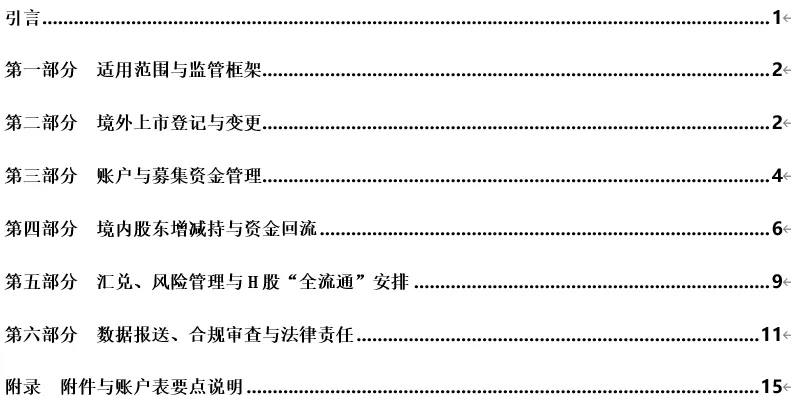 • 附件2《境外上市相关账户管理一览表》:列明与境外上市相关的账户类型及其收入/支出范围(仅描述境外上市相关内容)。核心账户包括:境内企业资本项目-结算账户(2103)、境内股东居民境外证券与衍生品账户(2403)、中国结算H股“全流通”专用外汇账户(2417)以及中国结算香港境外外汇专用账户。
