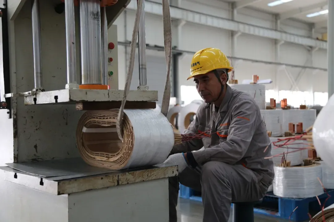 两万平方米的生产车间内,机器轰鸣,一卷卷如“大号胶带”的硅钢卷料经过自动化生产线裁剪、叠装成铁芯,一块块绝缘材料经过切割、去毛刺、倒圆角、防潮处理等流程进行精细处理,工人师傅熟练地操作变压器绕线机绕制线圈······车间内智能物流系统、智能吊装设备穿梭其间,将部件精准移送。经过一系列精密工序,一颗颗精密的“电力心脏”——电力变压器便在此诞生。