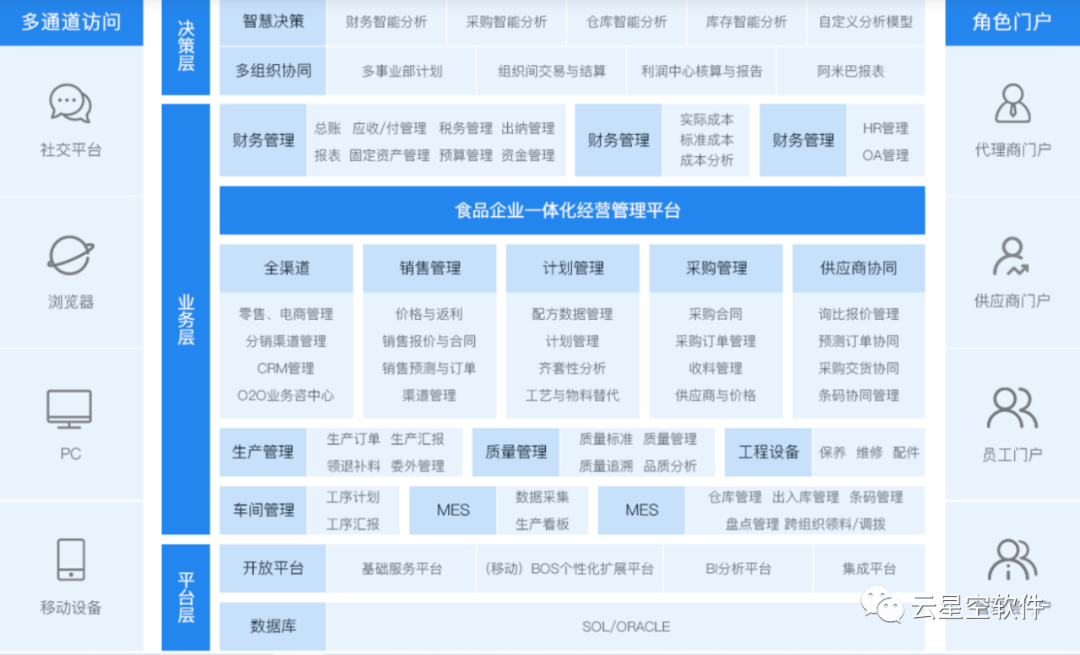 3、业务统一共享中心。支持食品行业灵活的业务架构。拉通总部与下属分子公司,采购、销售、生产之间的业务分工与协作。
