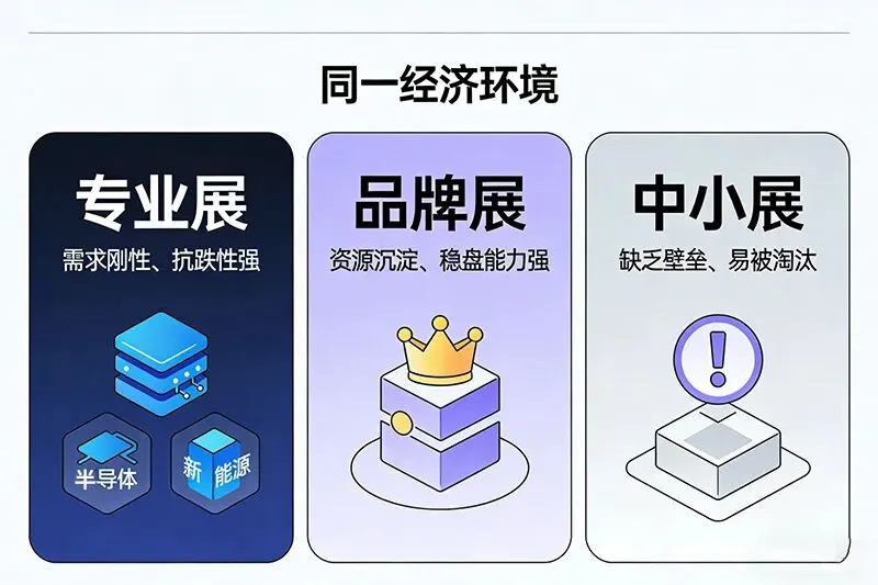 专业展:因聚焦细分产业刚性需求(如供需/技术对接、供应链协同),企业即便压缩预算,也会保留核心专业展的参展投入,抗跌性显著强于综合展,部分优质专业展甚至能保持规模稳定。