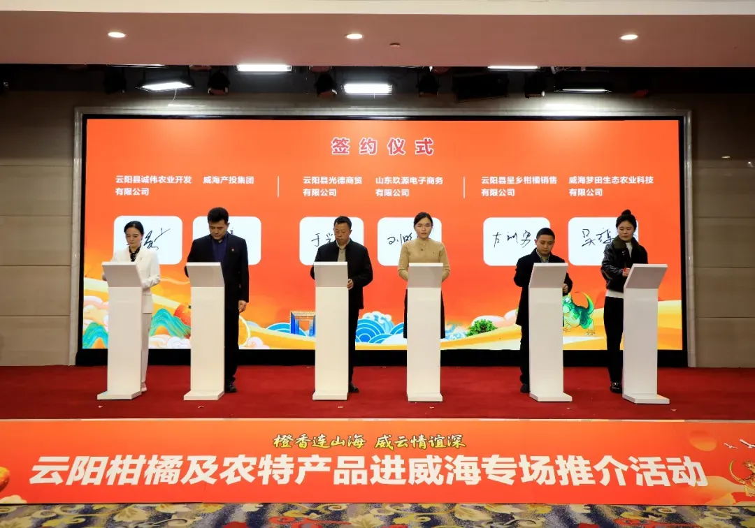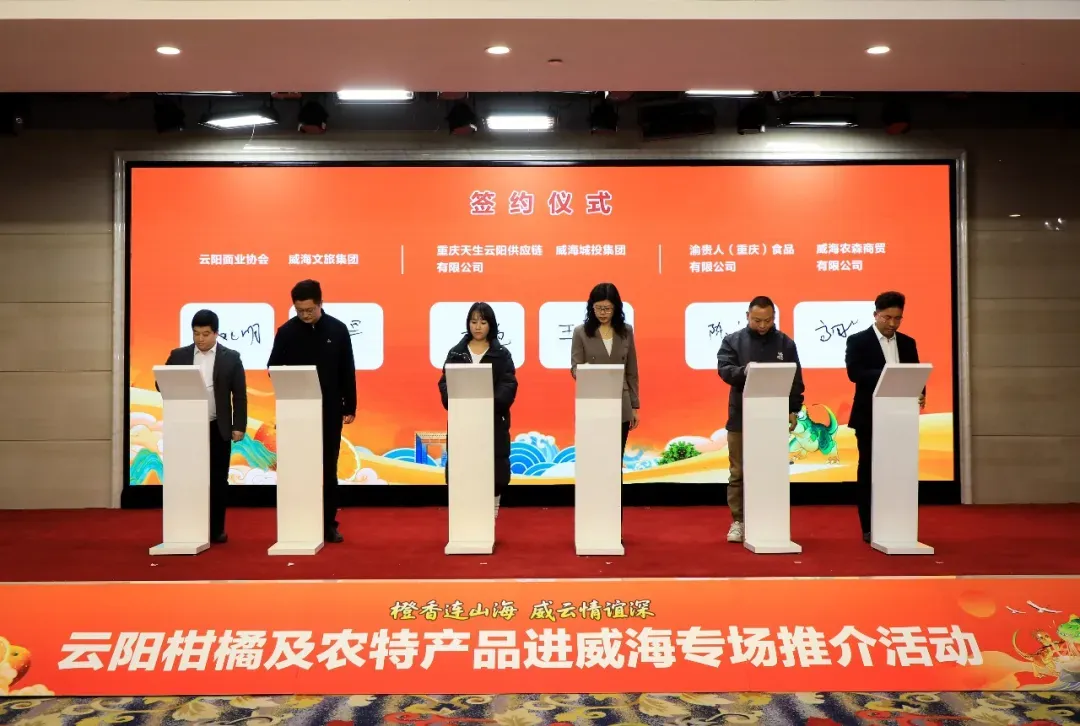 签约仪式上,云阳县多家企业及协会分别与威海相关企业达成柑橘及农产品销售合作协议,为两地产销对接奠定坚实基础。随后,两地相关部门及单位负责人共同按下启动手印,标志着威云“山海相连、产销相通”的合作之路全面开启。