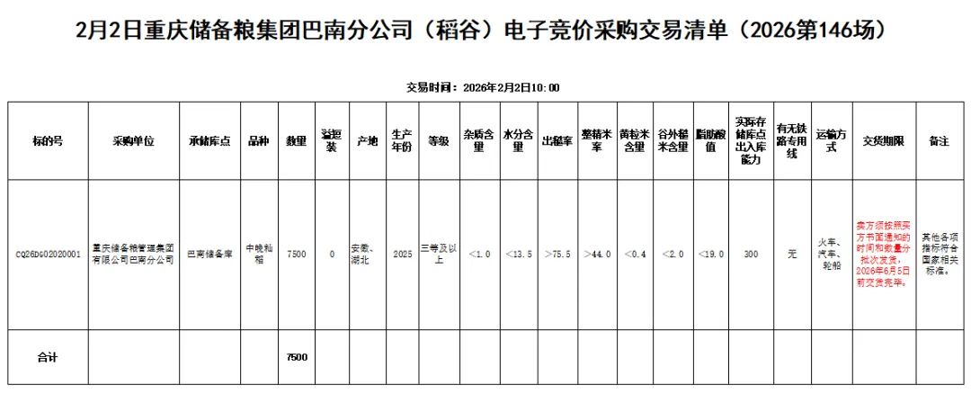 受重庆储备粮管理集团有限公司巴南分公司委托,重庆市粮油批发市场有限责任公司(即国家粮食重庆交易中心,以下简称“批发市场公司”)定于2026年2月2日10:00举办重庆储备粮集团巴南分公司(稻谷)电子竞价采购交易会,现将有关事项公告如下: