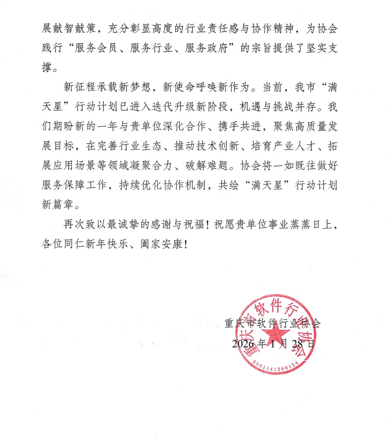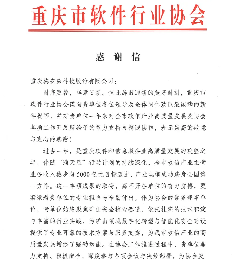 近日,梅安森收到重庆市软件行业协会发来的感谢信,协会对梅安森在过去一年为重庆软信产业发展及协会工作所提供的支持表示感谢。