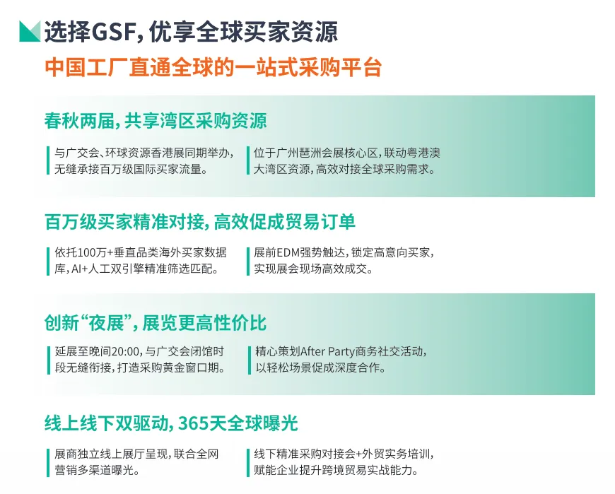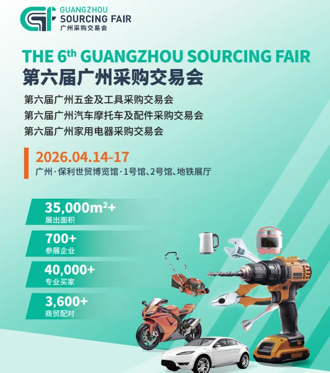 由环球资源、保利展览和光合作用共同打造的“第六届广州汽车摩托车及配件采购交易会”将于2026年4月14-17日在广州保利世贸博览馆举行。本届展会将为700家参展企业与40,000名专业买家打造五金及工具、摩托车及零配件、家用电器专业出口贸易平台,助力中国企业走出去,加速打开贸易渠道。