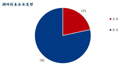 本次调研样本以基建企业为主(占比 78.43%),房建企业占比 21.57%。从整体情况来看,多数企业当前资金状况处于一般水平,仅 16% 的企业资金同比有所增多;节前大部分企业缺乏补库意愿,近 70% 的企业集中在节前 5-10 天停工,近 60% 的企业计划在节后 10-15天复工;节后新开工项目数量偏少,市场仍以续建项目为主。