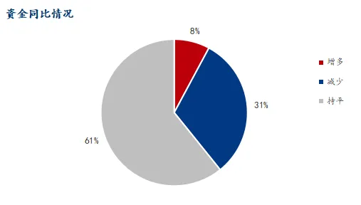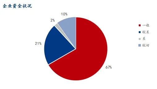 资金状况方面,66.67% 的企业资金情况处于一般水平,21.57% 的企业资金状况较差,仅 1.96% 的企业资金状况紧张,9.8% 的企业资金情况较好。从同比变化来看,60.78% 的企业资金情况与去年持平,31.37% 的企业资金同比减少,仅 7.84% 的企业资金同比增加,整体反映出行业资金面中性偏紧的态势。