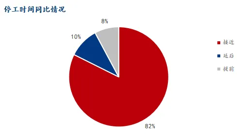 节后复工方面,大部分企业复工时间集中在节后15-20天,与往年节奏基本接近。其中,37.25%的企业计划节后15天复工,21.57%的企业将于节后10天复工,13.73 的企业计划节后20天复工,9.8%的企业在节后5天复工,7.84%的企业节后30天复工。从同比变化来看,80.39%的企业复工时间与往年接近,11.76% 的企业复工时间延后,7.84% 的企业复工时间提前。