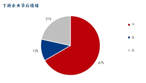 价格预期方面,下游企业对节后市场表现相对理性。66.67% 的企业预计节后钢价保持稳定,21.57% 的企业持看跌态度,仅 11.76% 的企业认为节后价格会较节前上涨,整体市场预期以平稳为主。