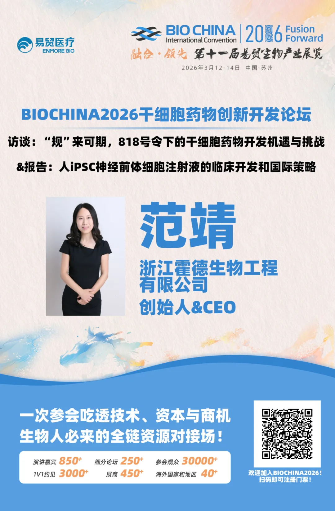 BIOCHINA2026(第十一届)易贸生物产业展览将于3月12-14日在苏州举行。霍德生物创始人&CEO范靖受邀出席盛会,并将于BIOCHINA2026 干细胞药物创新开发论坛分享行业前沿洞见与实践经验,与全球同仁共同探讨生物医药产业的未来发展路径。