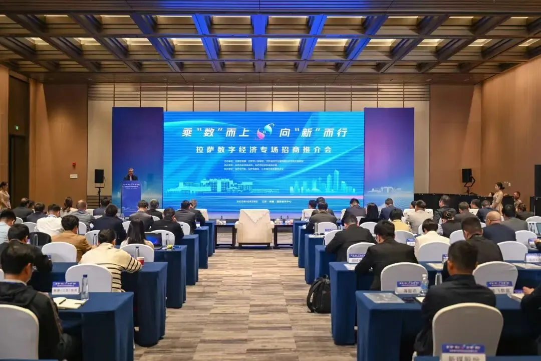 10月29日,借助2025上市公司高质量发展论坛的交流合作平台,拉萨数字经济专场招商推介会在江苏省南通市举行。这是推介会现场。