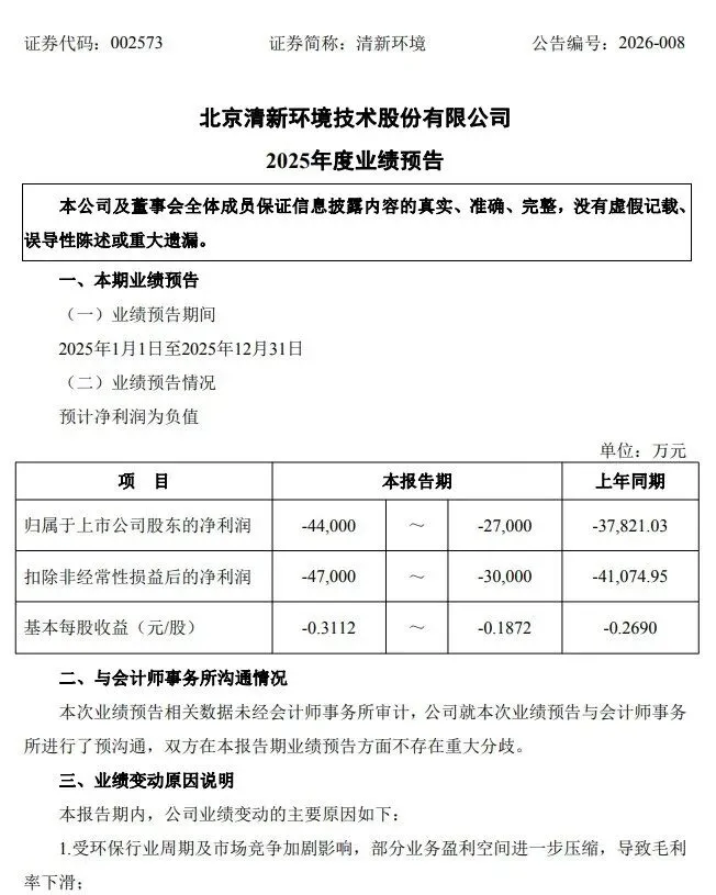 近日,主营以工业烟气脱硫脱硝除尘为核心的大气污染治理的清新环境发布《2025年度业绩预告》。2025年全年,公司实现归属于上市公司股东的净利润-44000万元~-27000万元,扣除非经常性损益后的净利润-47000万元~-30000万元,基本每股收益在-0.3112元~-0.1872元。