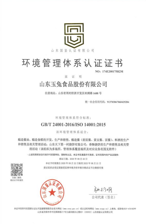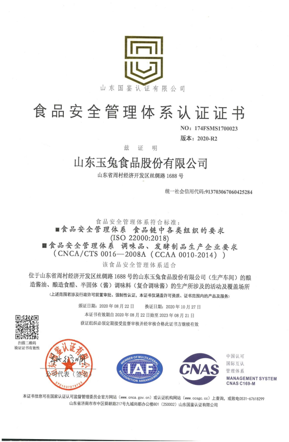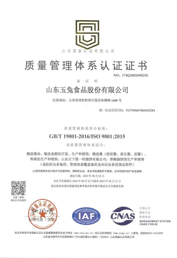 玉兔公司坚持“没有质量,一切都是负数”,在同行业率先通过ISO9001国际标准质量体系,HACCP食品安全体系、ISO14001环境管理体系、国家测量管理体系、国家标准化良好行为等五项认证,不断夯实管理基础,增强企业核心竞争力。