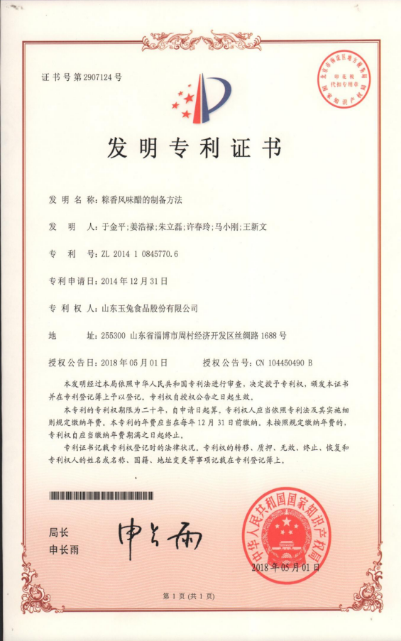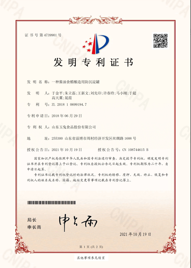 公司自主研发的酱油高效清洁生产工艺、闭路循环工艺、冷却水循环使用新工艺、原料高温闪蒸工艺等关键技术都体现了自动化、集约化、高效化的生产理念,主要质量技术达到国内领先水平,产生了较好的经济效益和社会效益,顺应了国家大力倡导的“低碳环保节能”趋势与要求。基于红曲米醋的降血脂非全营养配方食品制备及产业化应用。以红曲米醋为核心组件的功能性保健醋降脂降压实际效果分析,填补了以食醋作为核心组件参与配制特殊医学用途食品的空白,技术水平达到国际领先。公司还投入巨资引进了具有国家领先水平的全自动全盘制曲机,超高温饱和热水瞬时灭菌和热能回收系统、智能化固液分离压榨系统,从原材料筛选到无菌化灌装实现了两化深度融合。