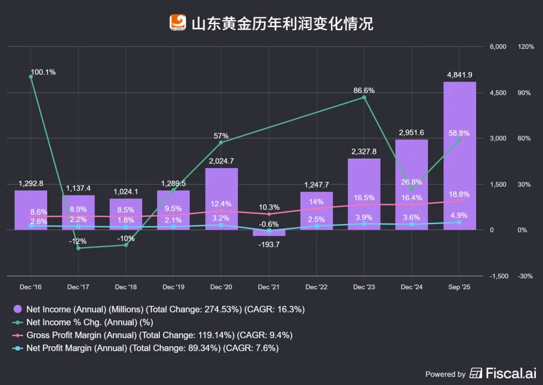 2024年,山东黄金实现归属于上市公司股东的净利润29.52亿元,同比增长26.80%;归属于上市公司股东的扣除非经常性损益的净利润29.91亿元,同比增长35.15%。2025年三季报,山东黄金实现归属于上市公司股东的净利润39.56亿元,同比增长91.51%;归属于上市公司股东的扣除非经常性损益的净利润39.45亿元,同比增长88.43%。