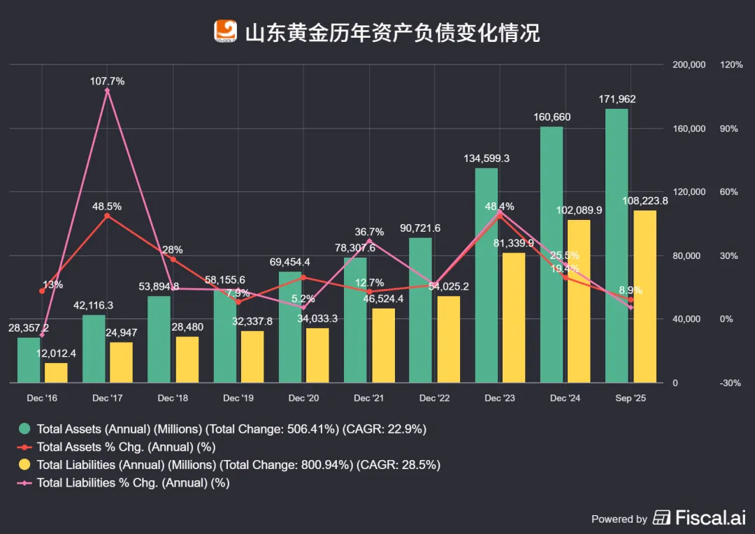 2024年,山东黄金的总资产为1,606.60亿元,较上年同期增长19.36%;总负债为1,020.90亿元,较上年同期增长25.51%;2025年三季报,山东黄金的总资产为1,719.62亿元,较上年同期增长8.93%;总负债为1,082.24亿元,较上年同期增长5.30%。