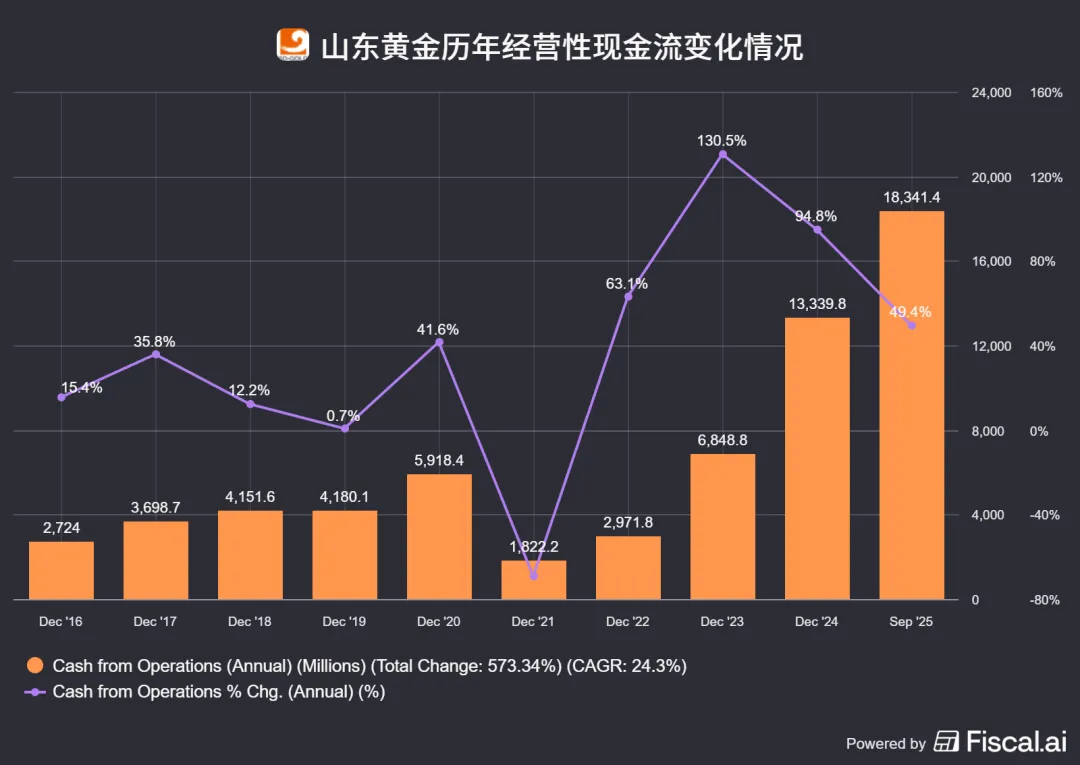 2024年,山东黄金的经营性现金流为133.40亿元,较上年同期增长94.78%;2025年三季报,山东黄金的经营性现金流为151.96亿元,较上年同期增长49.06%。