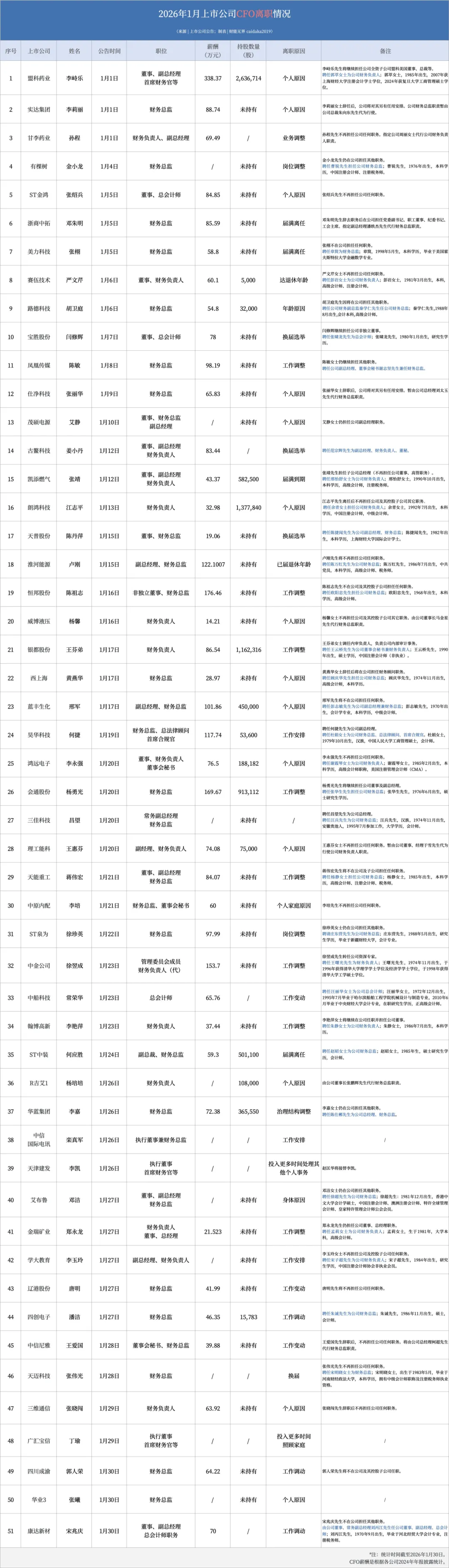 据财能无界不完全统计,1月共有51位上市公司CFO离职。
