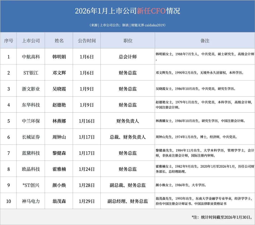 在统计过程中,我们发现,上述企业中有不少已经聘请了新任CFO,另外还有10家上市企业也在1月份找到了新任CFO,详情如下表: