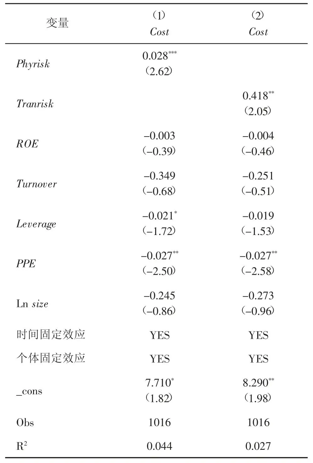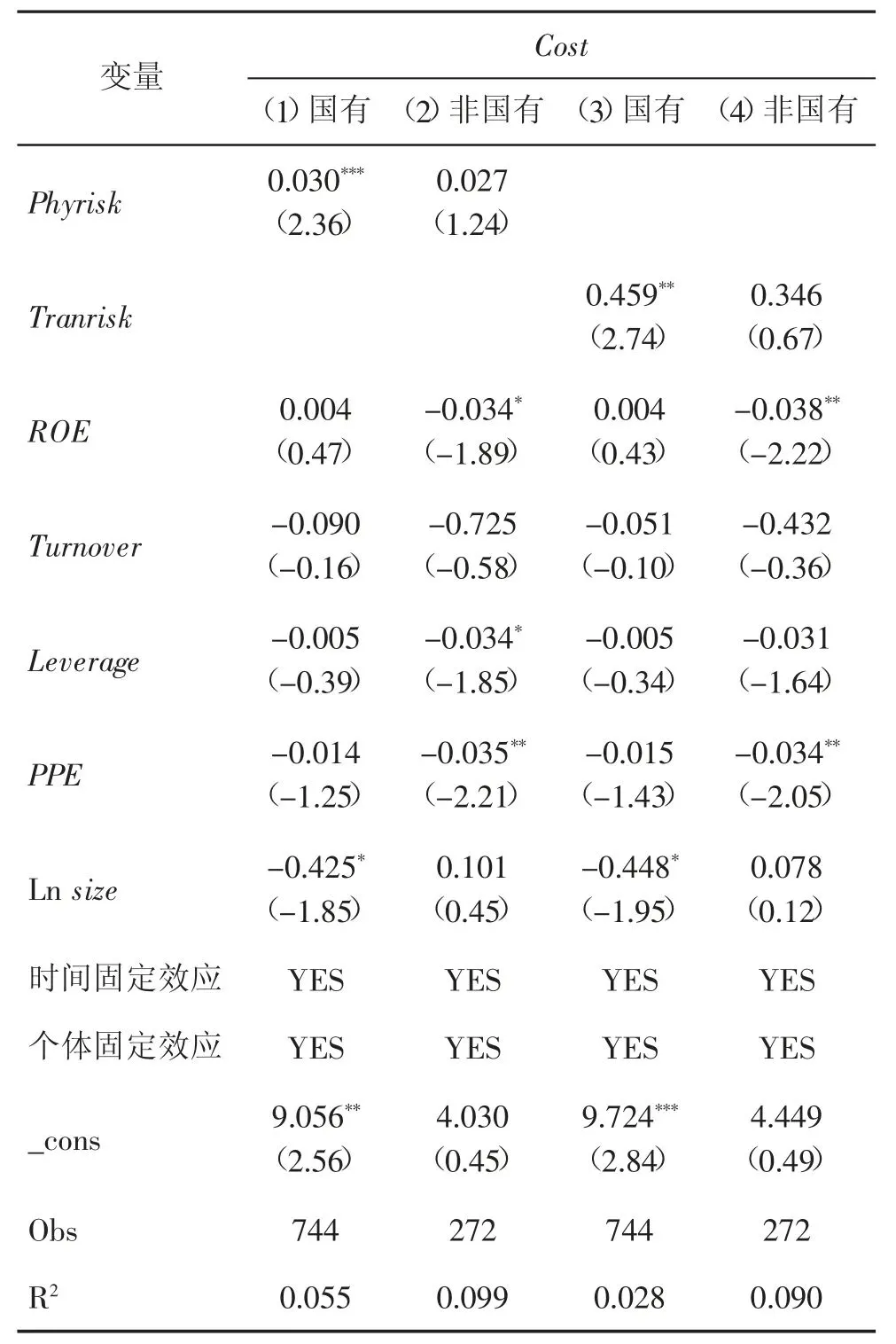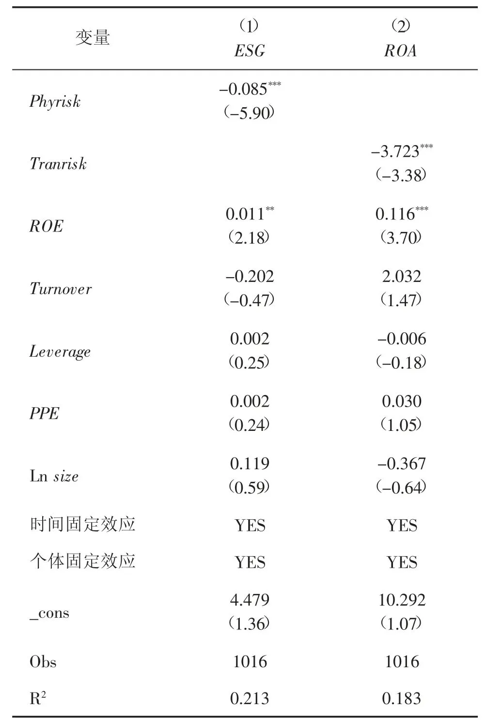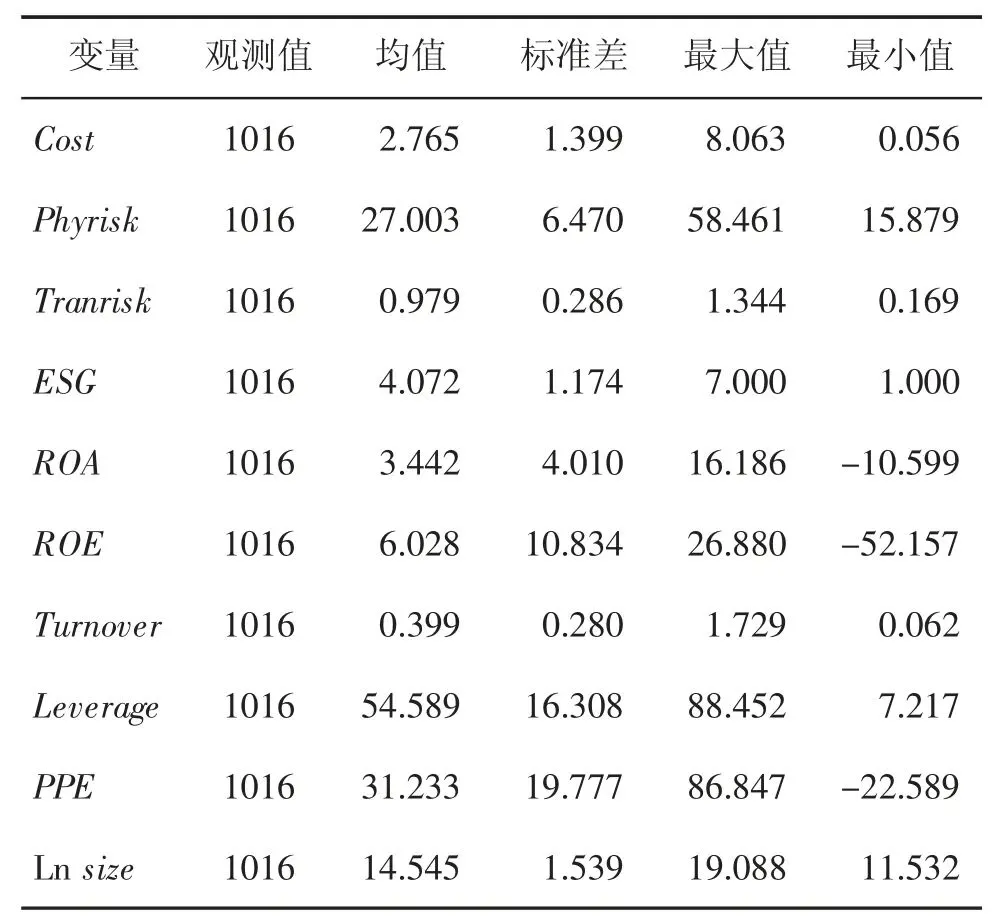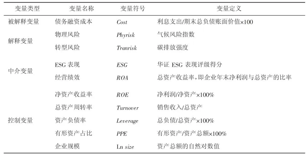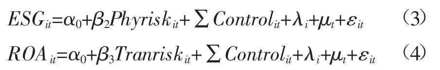 其中,Costit 表示企业i 在t 时期的债务融资成本;Phyriskit 表示企业i 在t 时期的物理风险;Tranriskit 表示企业i 在t 时期的转型风险;ESGit 表示企业i 在t 时期的ESG 表现;ROAit 表示企业i 在t 时期的经营绩效;Controlit 表示企业i 在t 时期的一系列控制变量;λi 表示企业个体固定效应;μt 表示时间固定效应;εit 表示随机误差项。