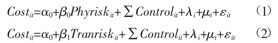 为了探究物理风险和转型风险对企业债务融资成本的影响,本文建立模型(1)、模型(2)进行实证分析。