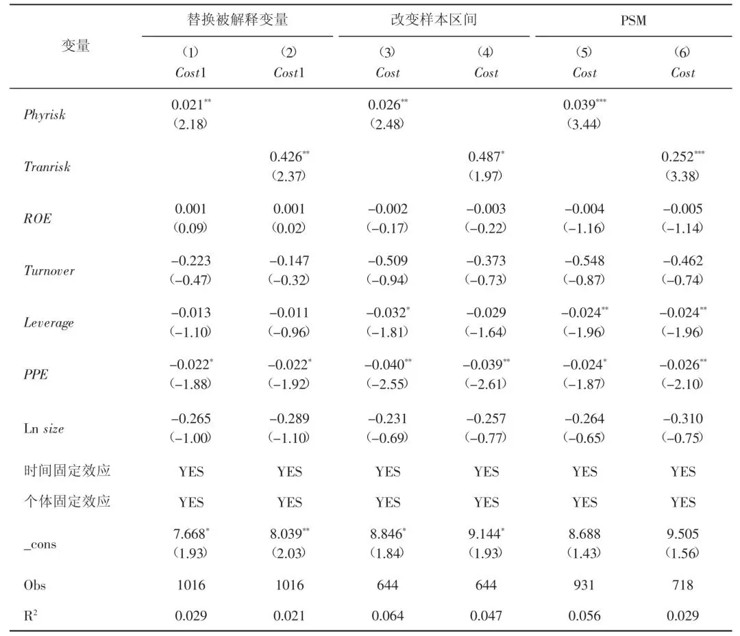 为了解决样本选择可能带来的内生性问题,本文选择1:1 最近邻匹配方式,以基准回归模型中的所有控制变量作为协变量,以物理风险与转型风险的均值为基准,区分出实验组和对照组(大于均值为实验组,小于均值为对照组),并对匹配后数据进行回归检验,结果如表4 中列(5)和列(6)所示。物理风险的系数为0.039,转型风险的系数为0.252,均在1%的水平上显著,表明本研究结论依然稳健。