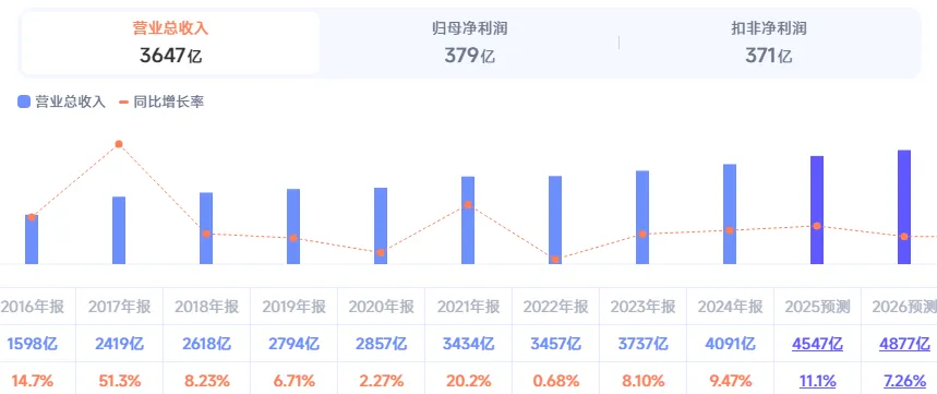 营业总收入3647亿元,同比增长13.8%