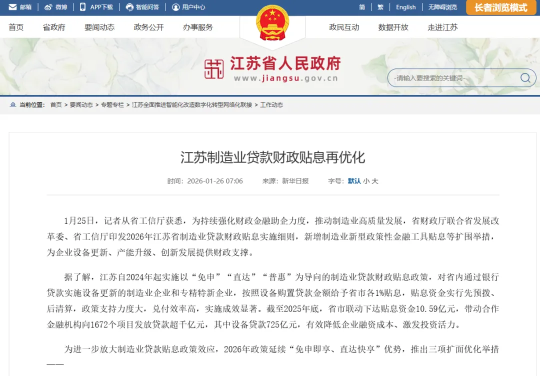 据了解,江苏自2024年起实施以“免申”“直达”“普惠”为导向的制造业贷款财政贴息政策,对省内通过银行贷款实施设备更新的制造业企业和专精特新企业,按照设备购置贷款金额给予省市各1%贴息,贴息资金实行先预拨、后清算,政策支持力度大,兑付效率高,实施成效显著。截至2025年底,省市联动下达贴息资金10.59亿元,带动合作金融机构向1672个项目发放贷款超千亿元,其中设备贷款725亿元,有效降低企业融资成本、激发投资活力。