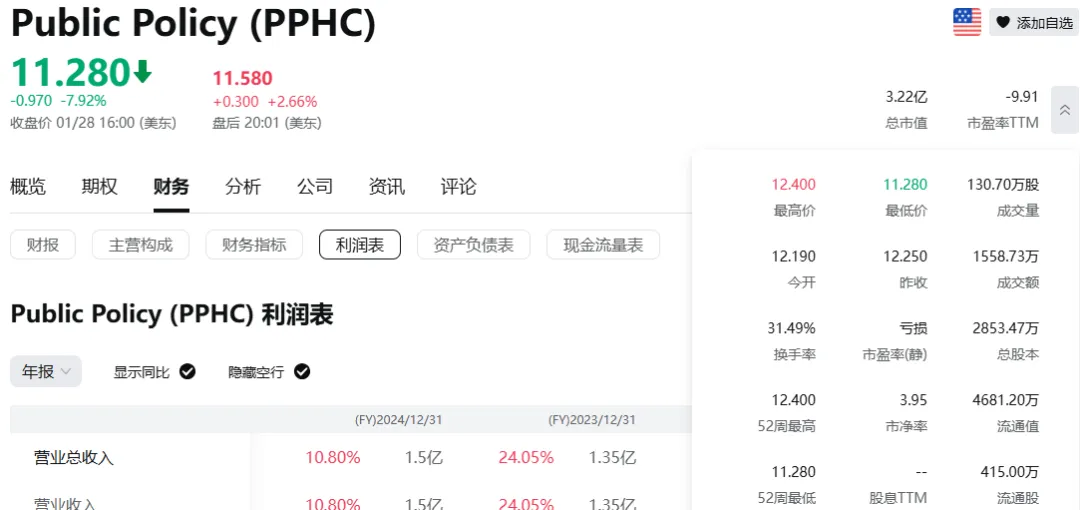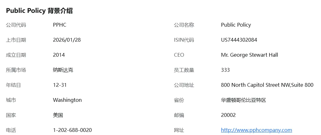 2026年1月28日,一家来自美国华盛顿的咨询公司--Public Policy Holding在纳斯达克上市,股票代码PPHC,发行了415万股,每股12.25美元,成功募资5084万美元!上市首日,公司总市值3.22亿美元。按SEC最新规定,纽交所中小板及纳斯达克资本市场首次IPO最低需发行1500万美元!【注:境外主体公司,无需CSRC审批,6~10个月就可以完成上市发行,比国内快!】 Public Policy Holding 总部位于美国华盛顿,是一家专注于公共政策研究、咨询与创新解决方案的领先机构。致力于连接政府、企业与社会,推动可持续治理与公共价值创造。业务覆盖政策评估、智慧城市、ESG战略咨询及公共事务管理,客户遍及北美、欧洲及亚太地区。目前,公司员工总人数333人。 根据招股书显示,2023-2024财年(截止至12月31日)营业收入分别是13500万美元、15000万美元;对应的净利润分别是-1424万美元、-2596万美元(亏损)。✅ 2025年Q3:启动美股IPO筹备,递交F-1文件