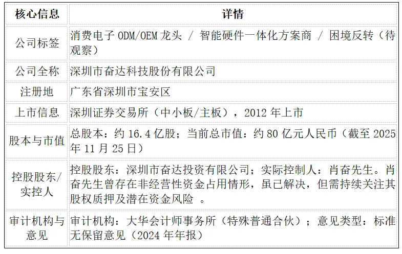 奋达科技是一家处于“战略转型与业绩修复”关键期的老牌消费电子ODM/OEM厂商。其核心优势在于电声和健康电器领域的深厚积累和稳定的国际大客户资源。然而,公司正面临消费电子行业周期性低迷、盈利能力极度脆弱以及高风险的行业竞争环境。其投资逻辑主要在于博弈AIoT浪潮下的业绩反转。