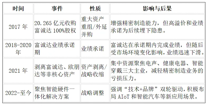 中期(2013-2020): 业务重心转向多元化智能硬件布局和精密制造补强。核心逻辑是利用资本市场资源,通过并购(如富诚达)向上游精密制造延伸,并布局智能穿戴等新兴领域,试图摆脱纯制造的低附加值困境。