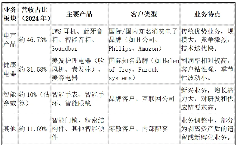 公司主营业务围绕消费电子整机及其核心部件的研发、设计、生产与销售展开,产品线涵盖电声产品(如TWS耳机、智能音箱)、健康电器(如美发护理电器)、智能穿戴(如智能手表/手环)以及智能家居等多个领域 。