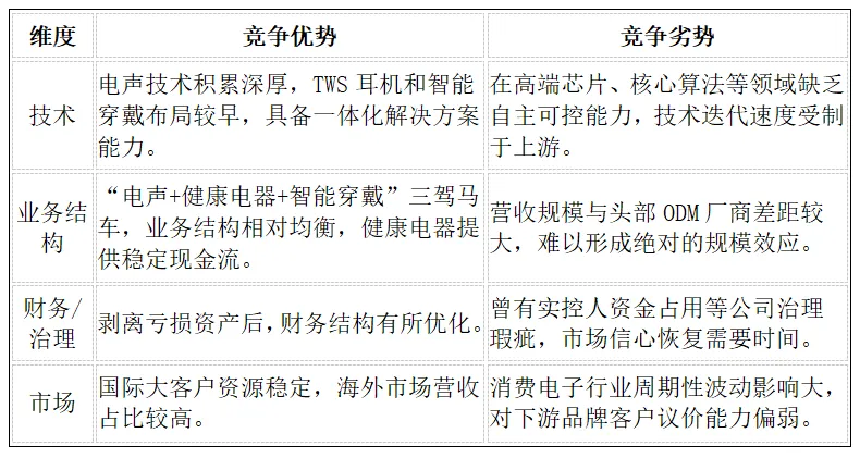 近期(2021-至今): 业务重心回归聚焦三大主业,强调技术创新和AIoT融合。核心逻辑是剥离亏损资产,集中资源在电声、健康电器、智能穿戴三大优势领域,通过技术创新和一体化解决方案,提升ODM/OEM的附加值,实现从“制造”到“智造”的升级。公司正积极将AI技术融入产品,以期在AIoT时代占据有利位置。
