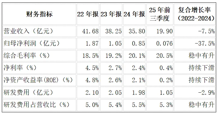 最新业绩: 2025年前三季度,公司实现营收19.90亿元,同比下降约15.46%;实现归母净利润仅0.076亿元,同比大幅下降超90%。这表明公司在2025年仍未走出低谷,盈利状况堪忧。