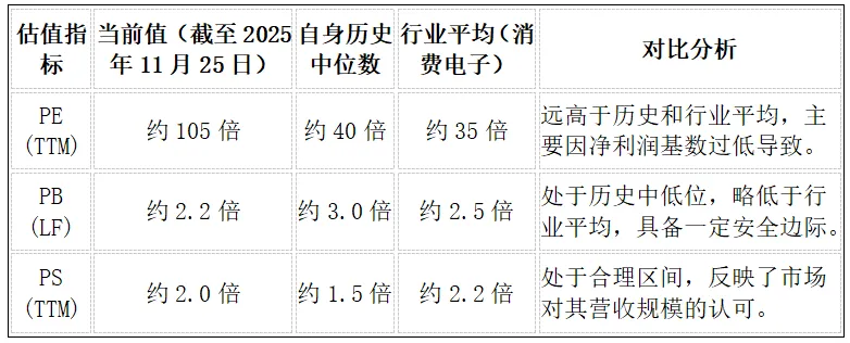 从PE(TTM)来看,奋达科技的估值显得极高,但这主要是因为其净利润基数过低,导致PE指标失真。如果以2025年前三季度年化净利润计算,PE已超过100倍,远超行业平均。因此,在当前情况下,PE指标的参考价值较低,投资者应警惕单纯使用PE指标可能带来的误判。