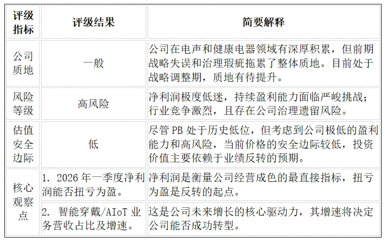 这种业绩的波动,使得市场对其“困境反转”的预期变得更加谨慎。投资者正在密切关注公司在健康电器这一稳定业务板块的表现,以及智能穿戴新业务的订单放量情况,以判断其是否能有效对冲传统电声业务的周期性风险。