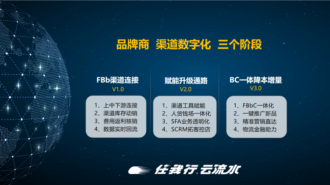 因此,品牌方数字化第一步就是需要企业去做一些基础的链接工作,把上中下游连接起来,让品牌方更够快速高效的去获取经销商库存、终端动销、费用返利核销、数据实时回流;第二个阶段品牌方则可以通过渠道工具赋能,实现“人、货、钱、场”一体化、SFA业务透明化、SCRM拓客控店等;第三个阶段才是去做到FBbC一体化的增量,例如新品可以一键推送到店、营销费用透明等。