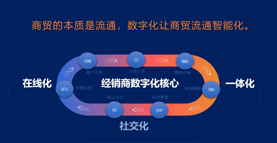 通过数字化系统,把客户、业务员管起来,把在线办公包括交易,包括账、货、仓配一体化全部管理起来,最终打造一个自动运营的企业,自动循环的企业。