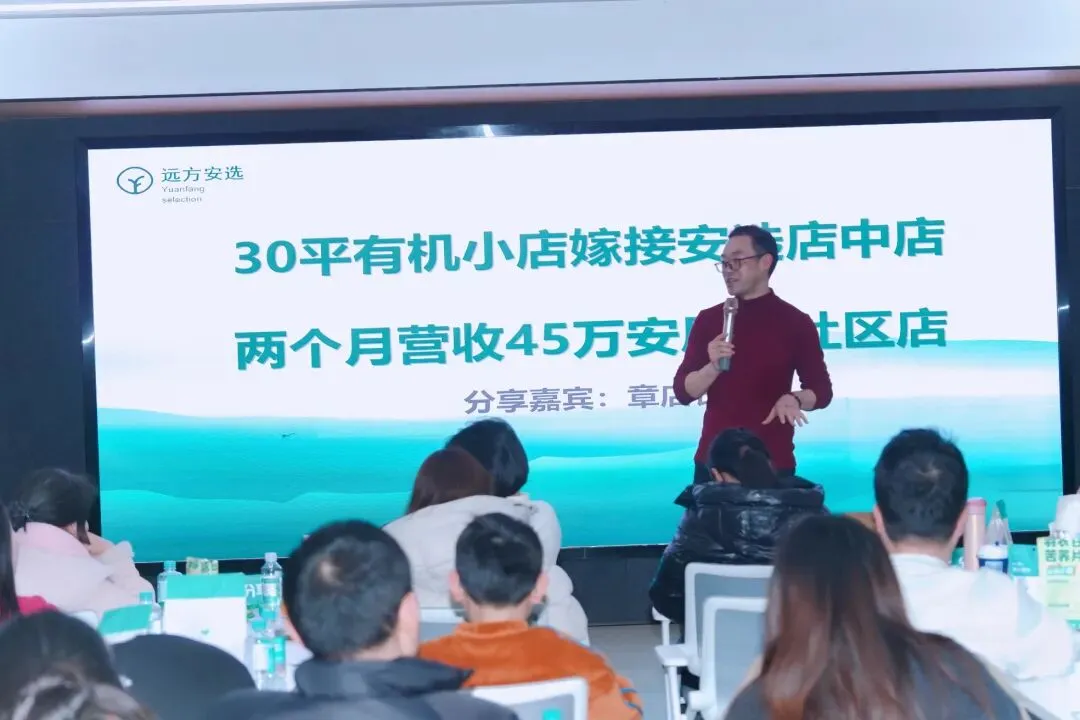 第二位分享嘉宾是开了10几年有机店嫁接远方安选店的章店长,他说他不擅长做生意,开以前的有机店没赚到钱,一次偶然机会了解到远方安选,去考察了几家安选店后,他觉得安选店中店这件事情可干,投入不高,供应链安全放心又是全品类,只要用心做好服务,客户会自然而然的复购。所以2个月创造了45万营收,一个多月回本,谁还敢说他不会做生意,以前只是选择问题,选择对了,一切都对了。