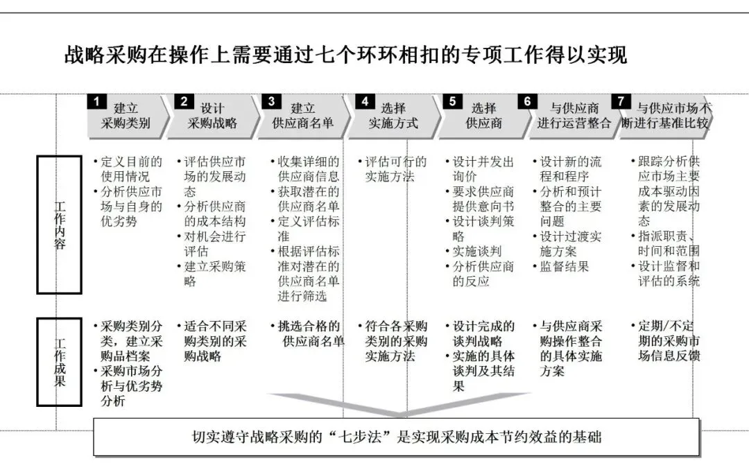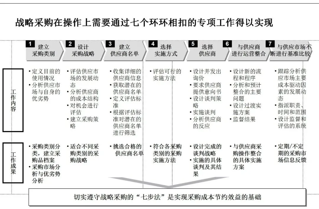 战略采购的核心,在于跳出单一交易,转向总成本管理与价值共创。它基于四项原则:数据驱动的协商、总成本分析、供需权力制衡,以及构建双赢伙伴关系。实现路径则依托严谨的“七步法”——从采购品类划分、市场分析,到战略制定、供应商筛选与谈判,最终完成运营整合与持续对标。