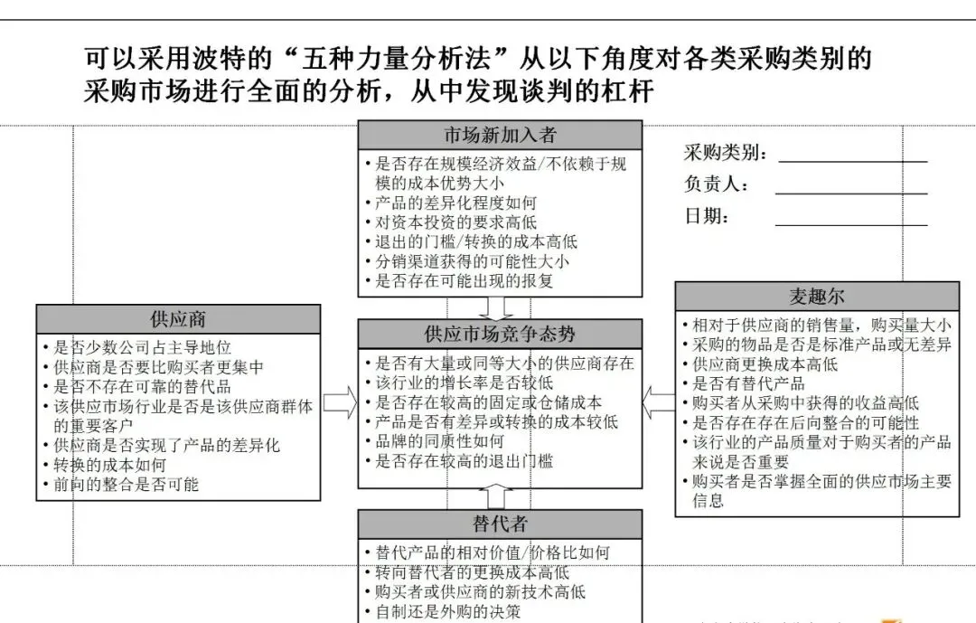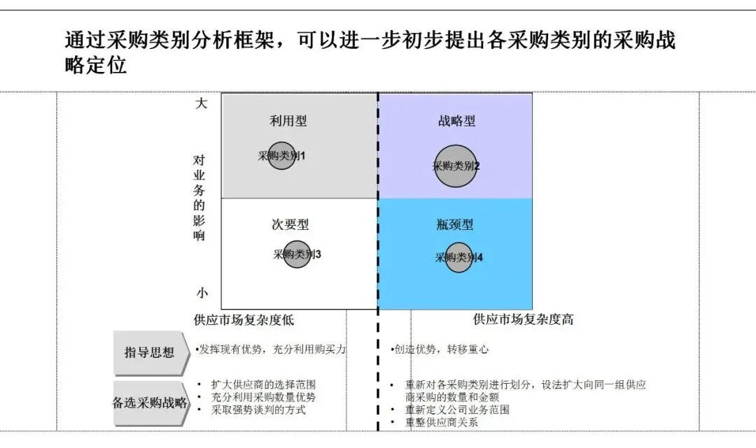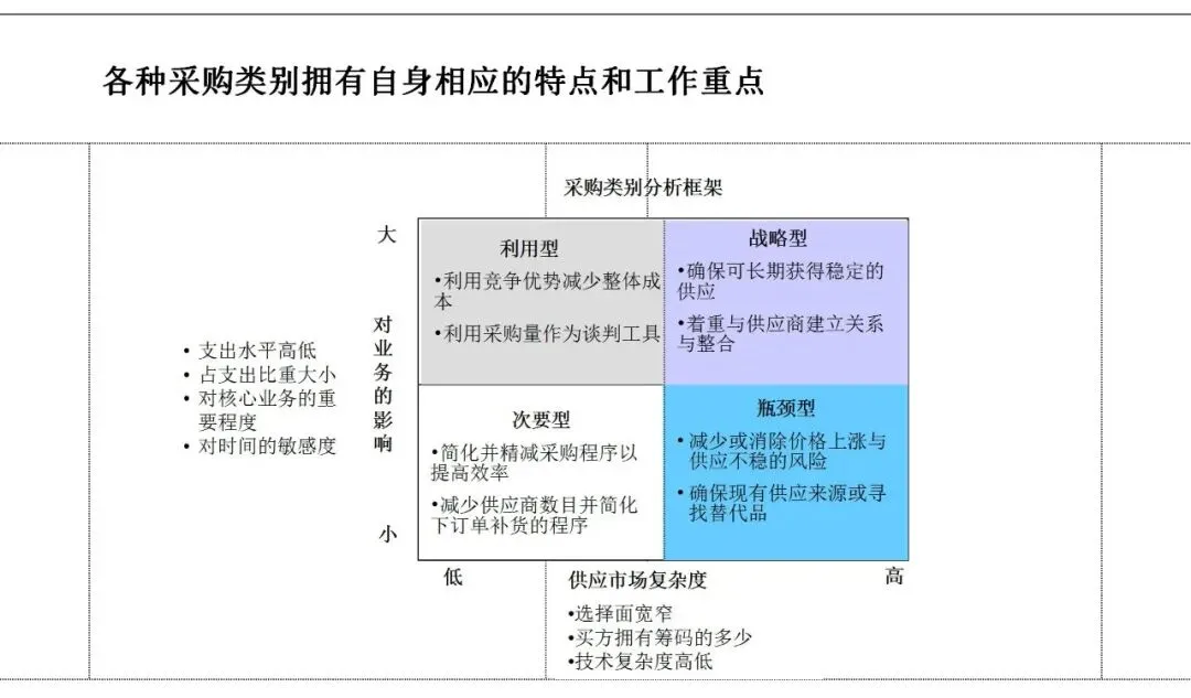 其中,科学的采购品类分析框架至关重要。依据支出比重、市场复杂度及对业务的影响,将物料分为战略型、杠杆型、瓶颈型与非关键型,并匹配差异化的策略。例如,对高支出、竞争充分的“杠杆型”物料,应集中采购量以获取最优价格;而对供应风险高的“瓶颈型”物料,重点则在于保障供应安全。