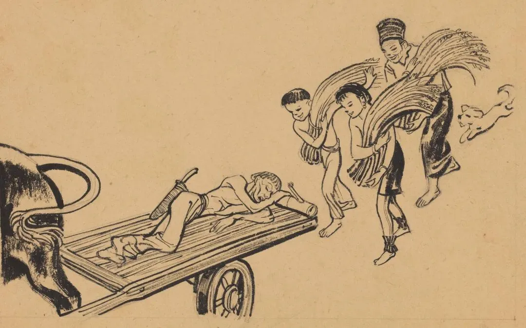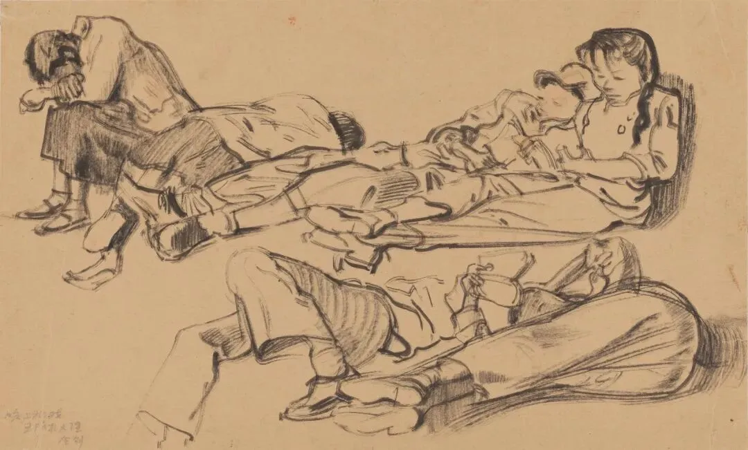 周令钊《排练场小憩》纸本竹笔,1947年,中央美术学院美术馆藏