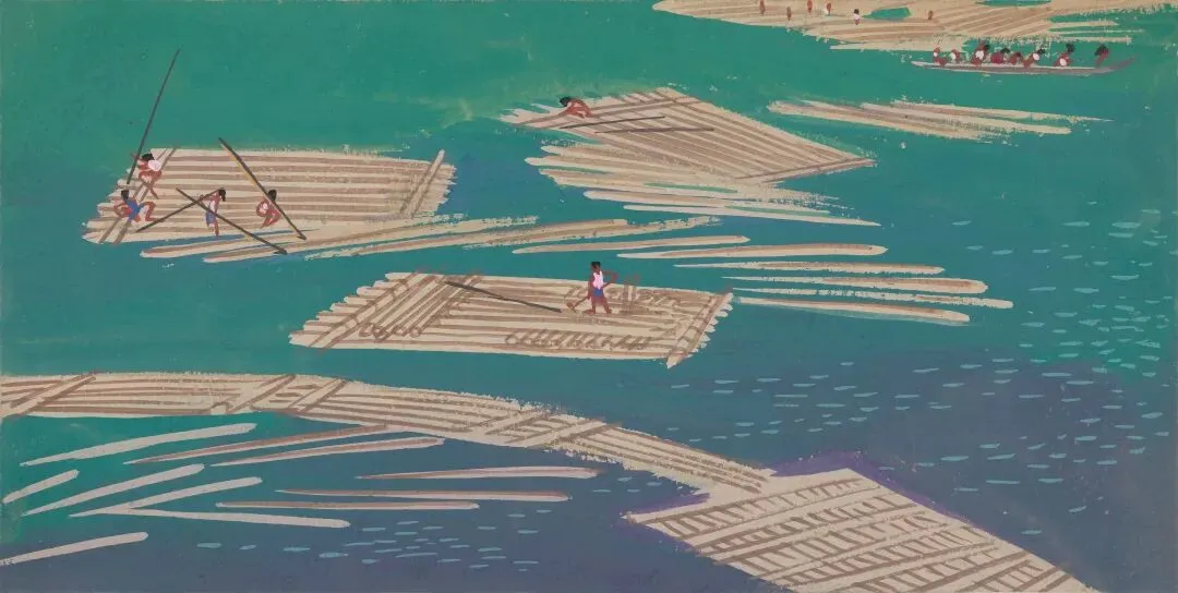 周令钊《放排》13.6×27cm,纸本粉彩,1963年,中央美术学院美术馆藏