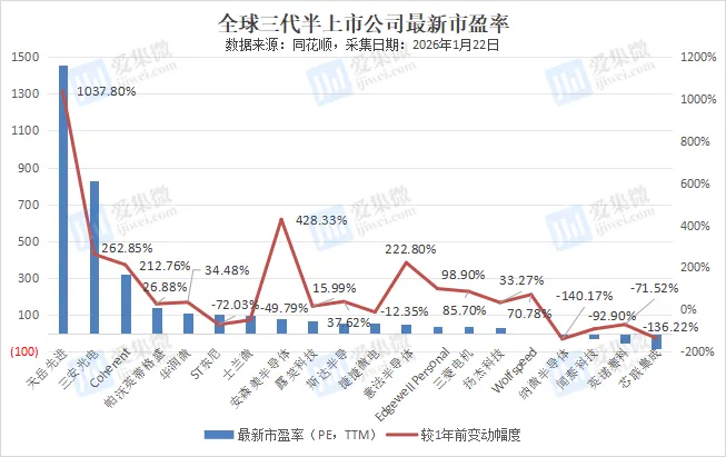 部分企业市盈率仍为负值,如英诺赛科、芯联集成、闻泰科技、纳微半导体及Wolfspeed,显示这些公司仍处于投入期或阶段性亏损,市场更关注其长期技术布局而非短期盈利。